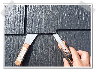 コロニアル屋根の下地処理の基本は、表面が剥(は)がれそうな部分を、きれいに落とすことです。